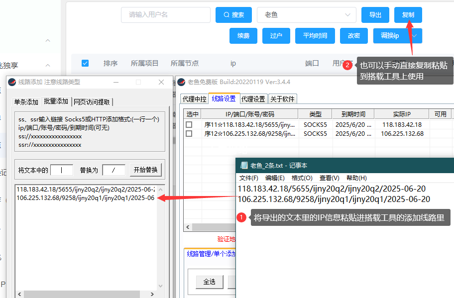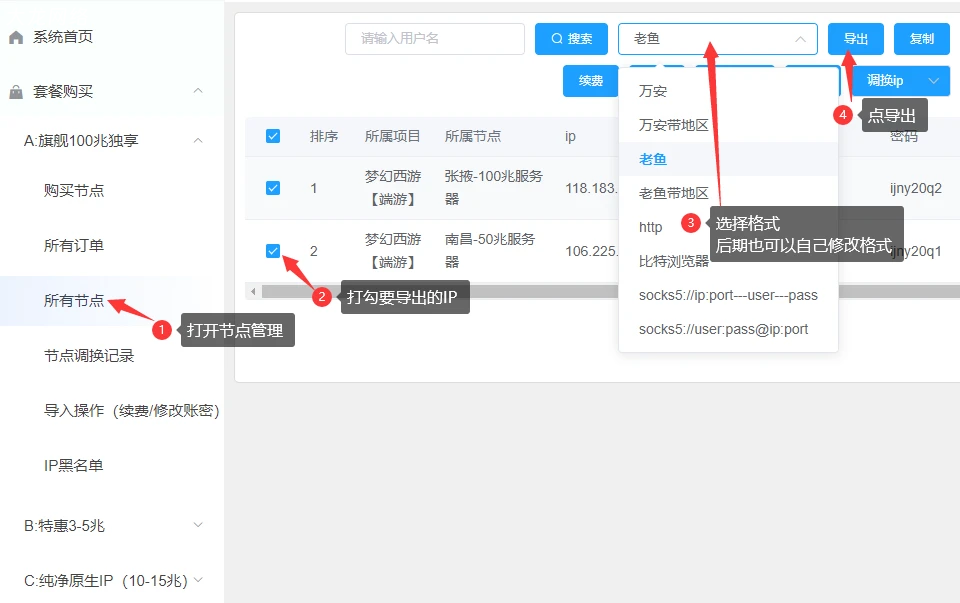 ✔勾选IP → 导出格式(支持老鱼/万安等)
